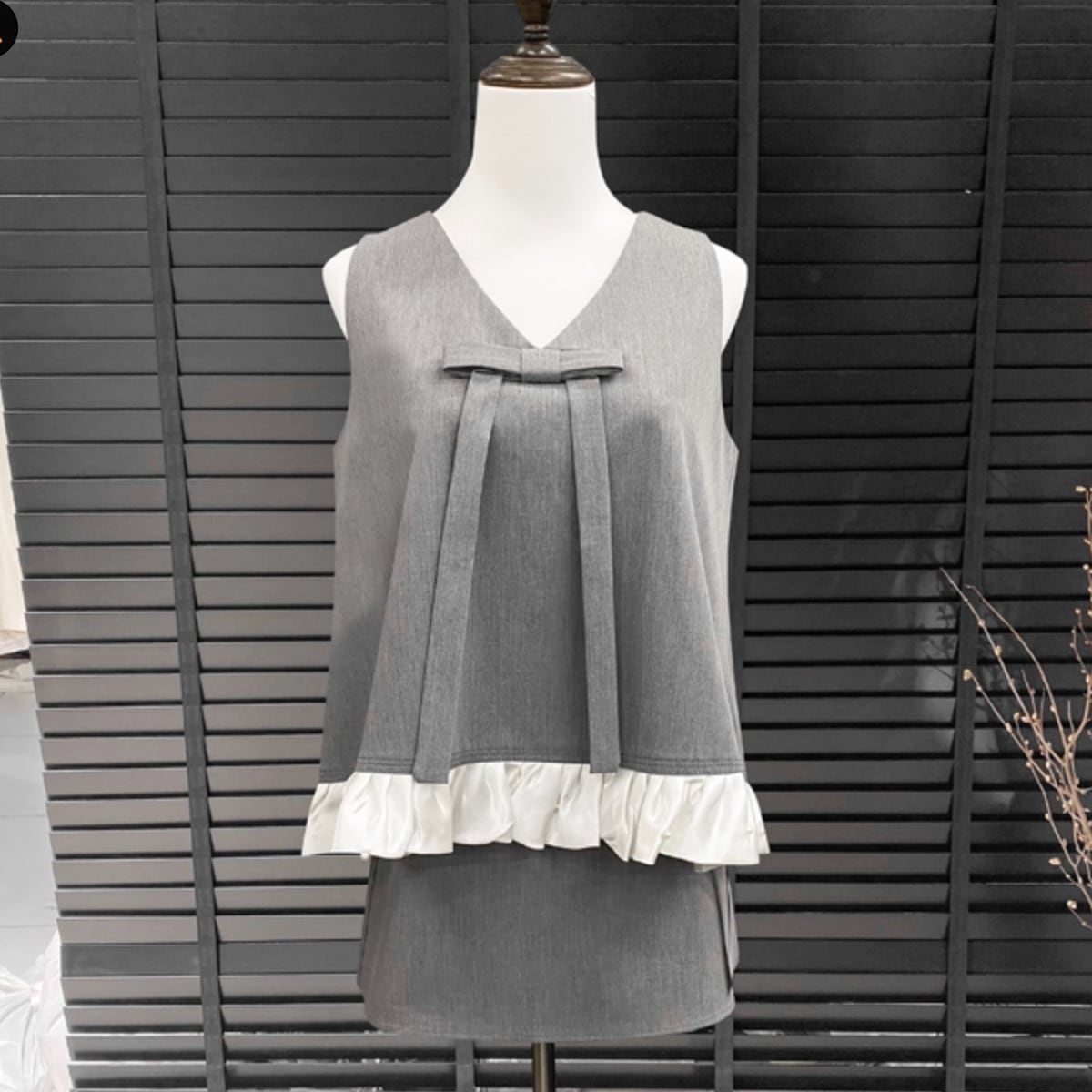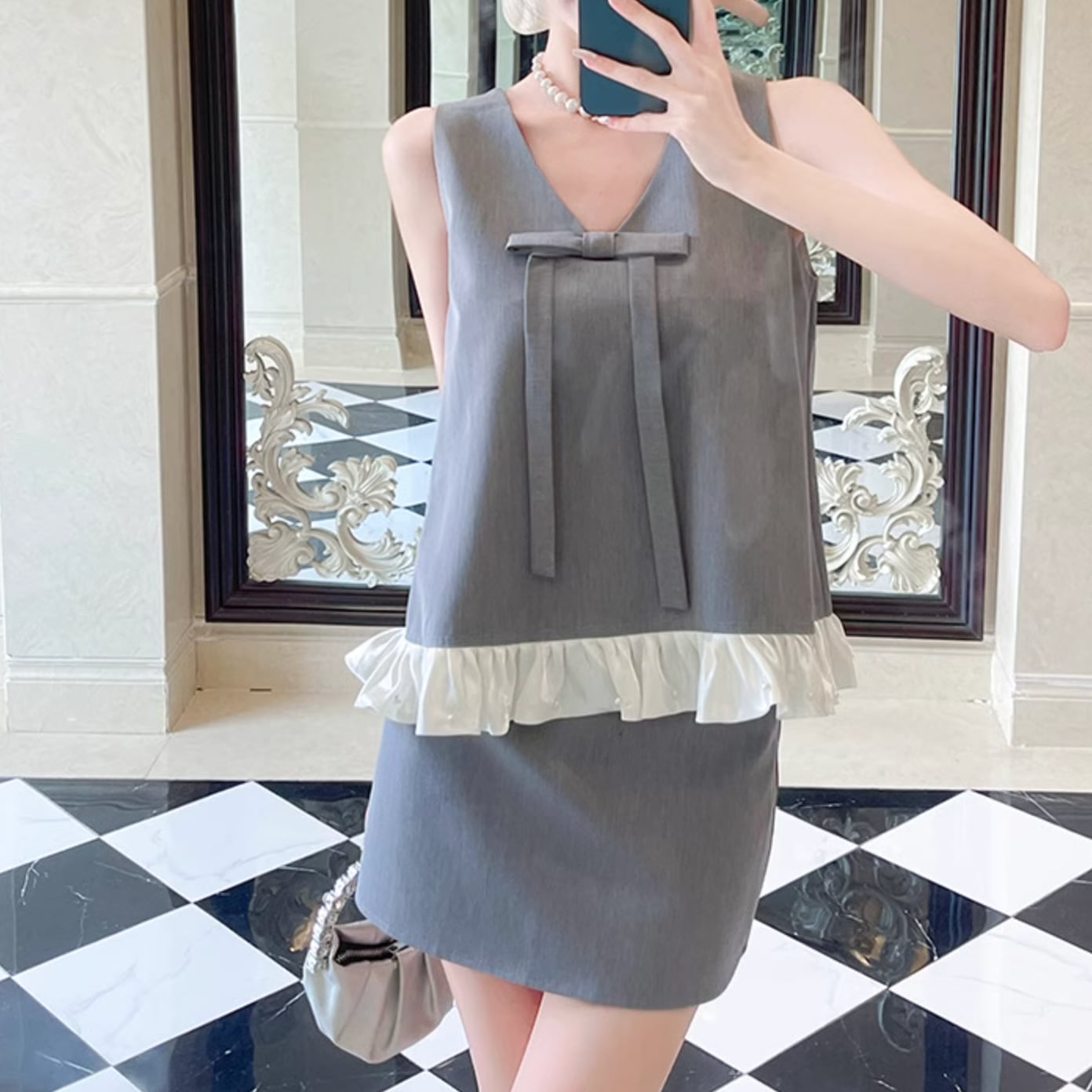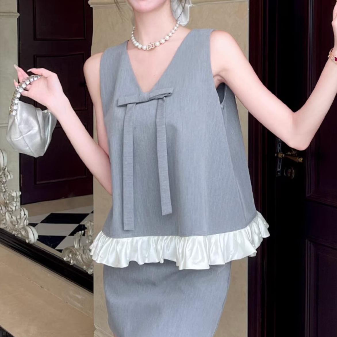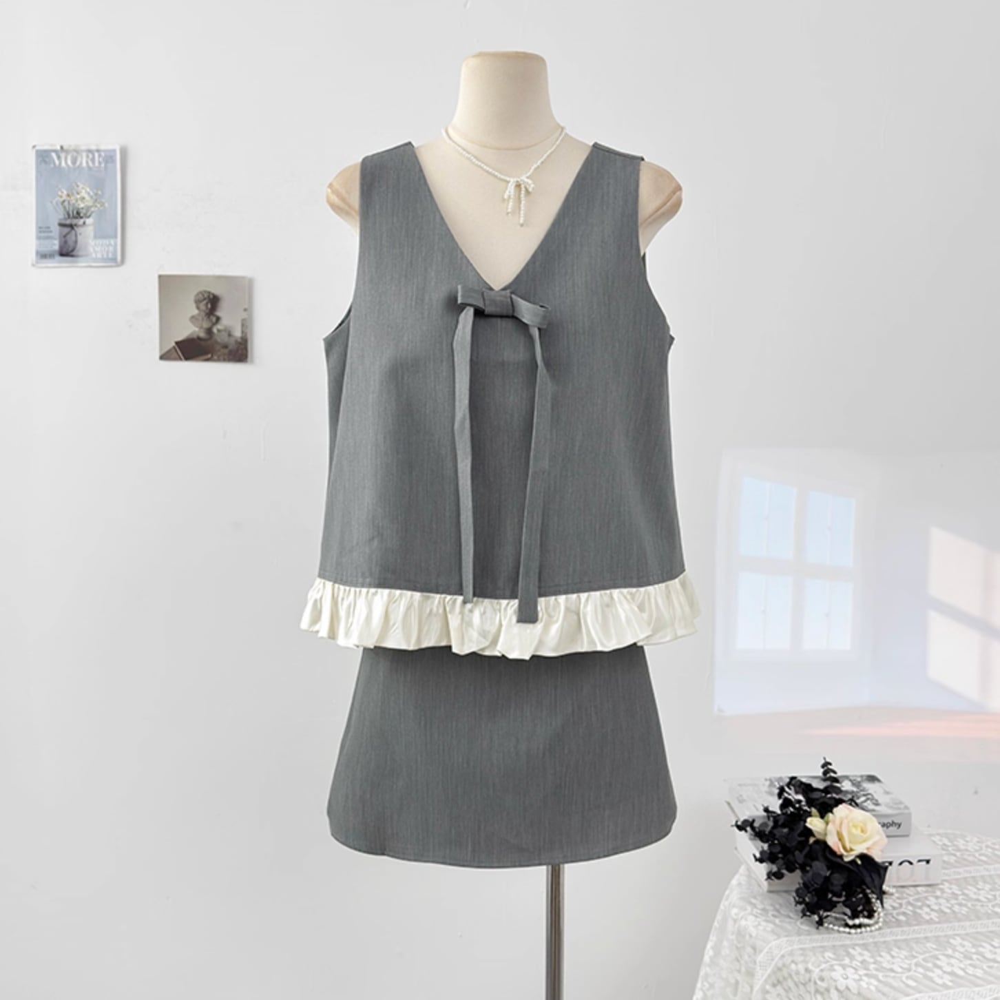 エレガントなリボンと裾のフリルが、洗練された大人フェミニンを演出するツーピースセット。
