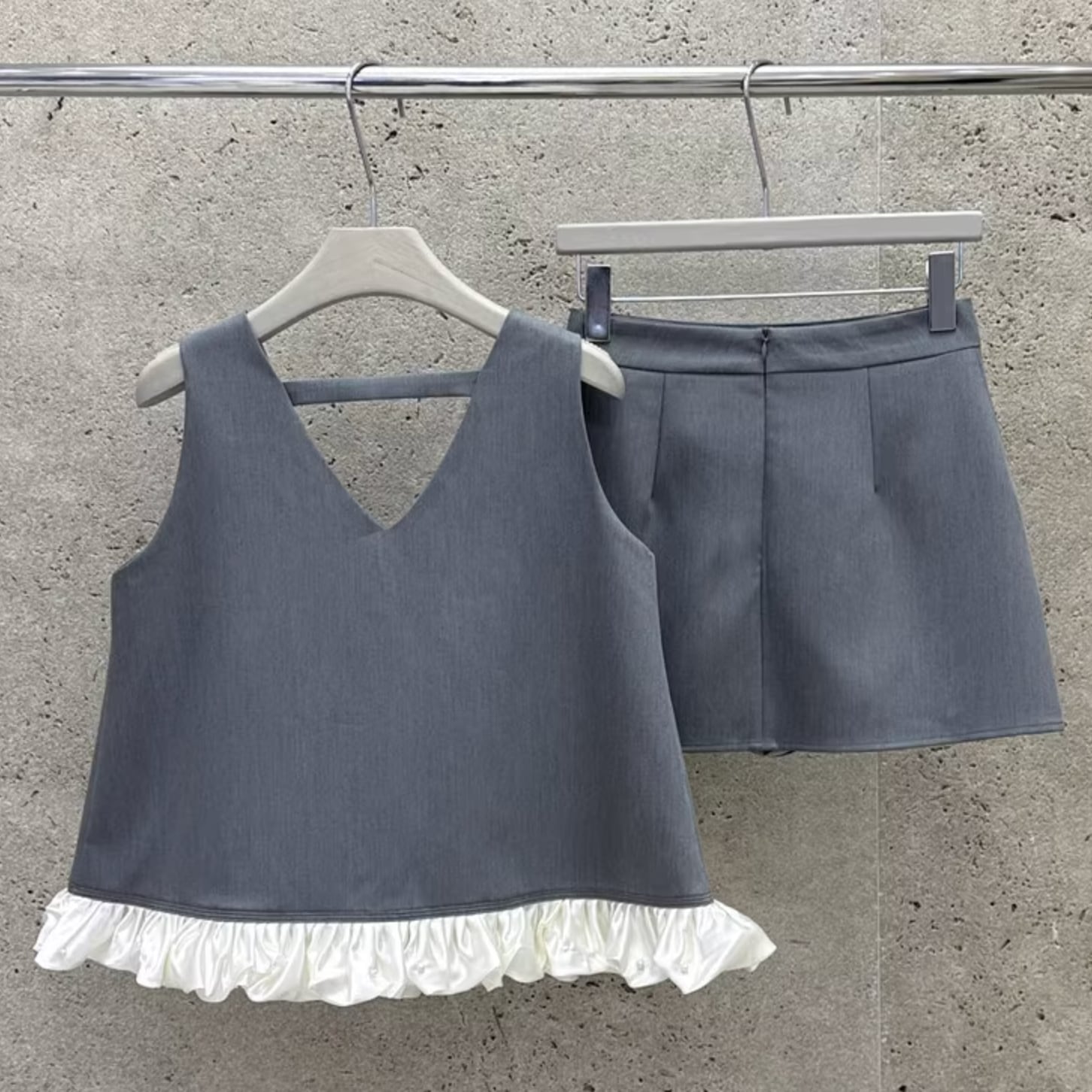 トップスは程よいAラインで体型を美しく見せ、ミニマムなスカートとの相性も抜群です。