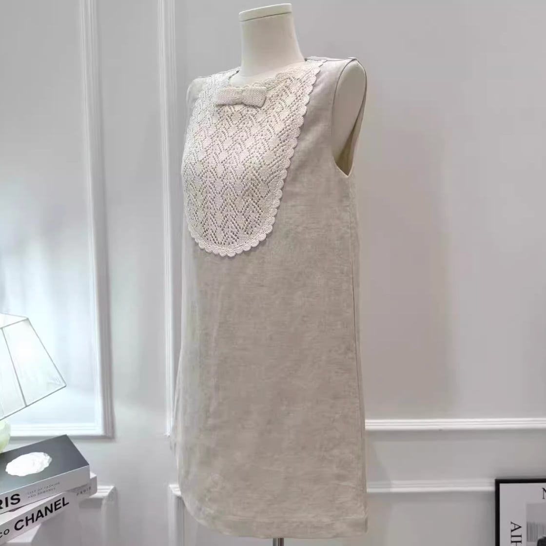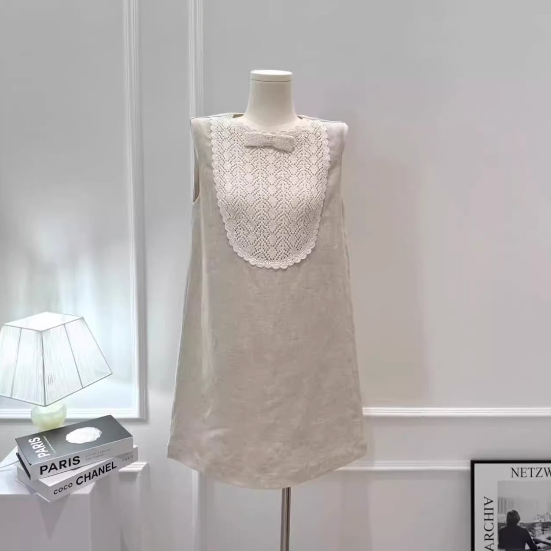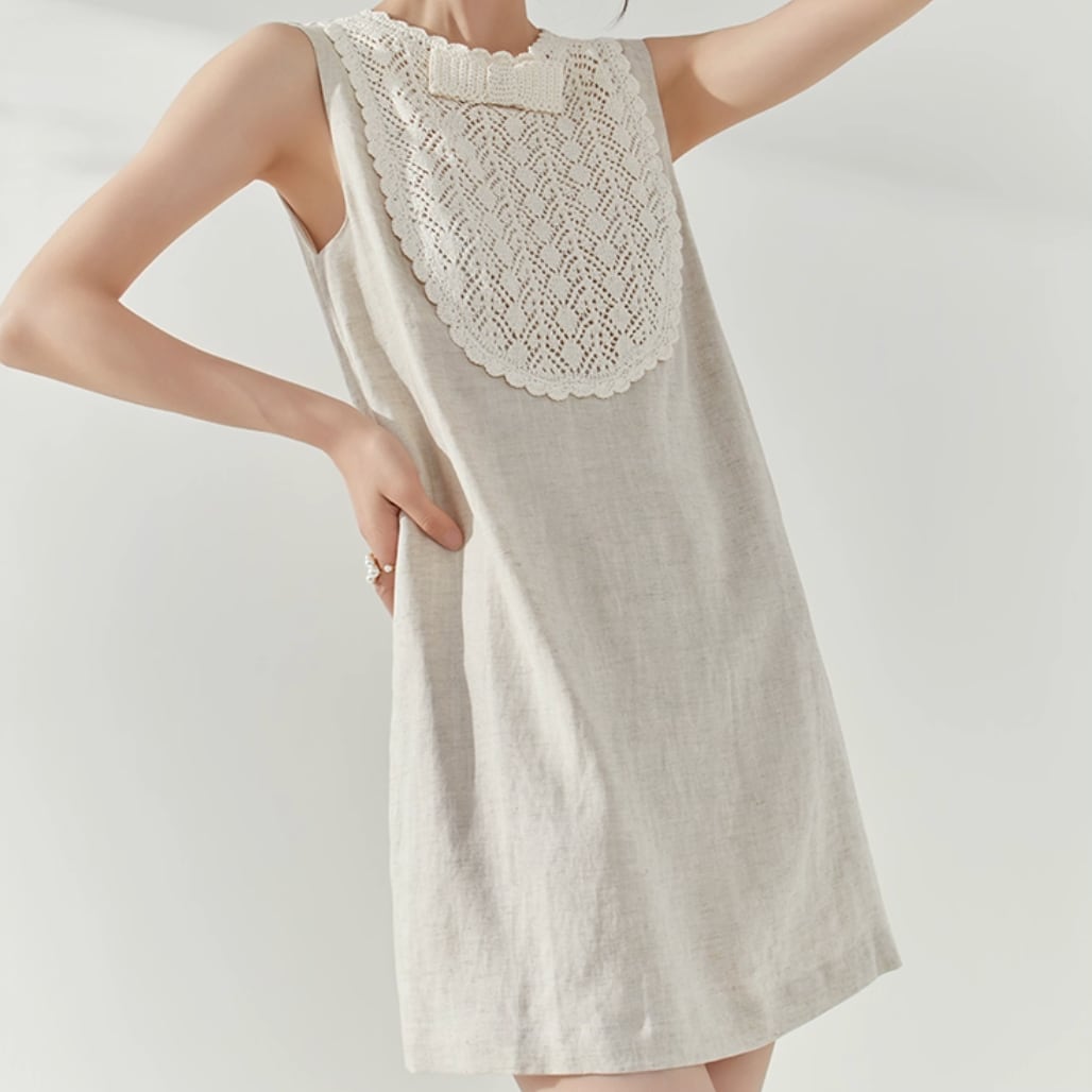 優しい光を纏うようなリネン調の生地に、クラシカルなレースヨークが上品なアクセントを添えます。