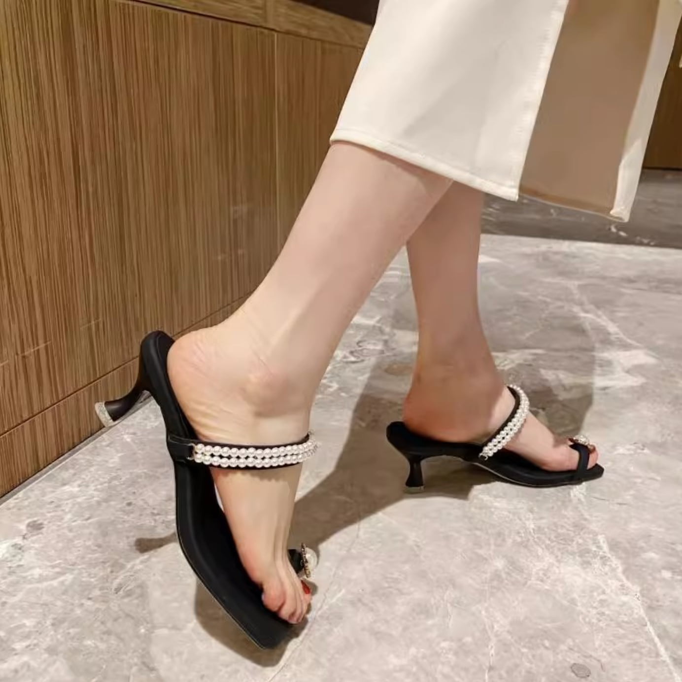 すっきりとしたスクエアトゥに、パールビジューが映えるエレガントなミュール。