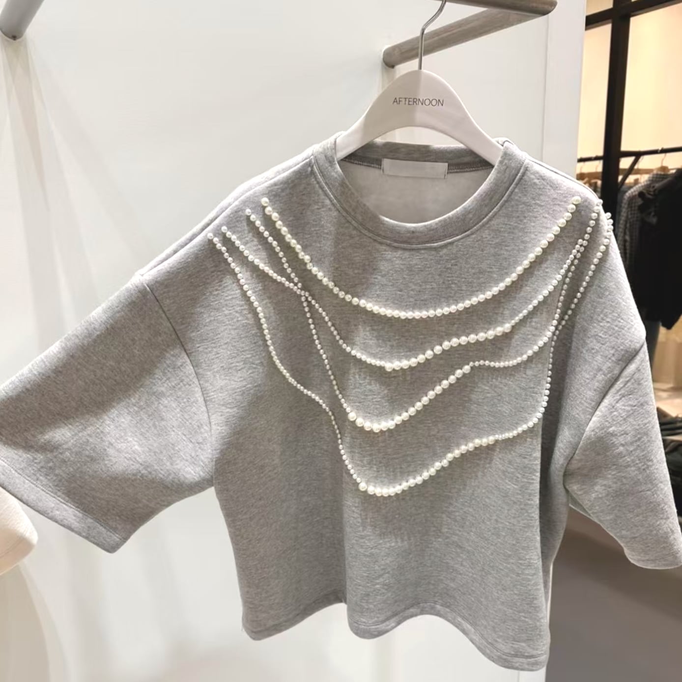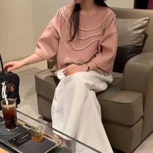 ミニマルなプルオーバーにパールチェーンが映えるトップス。