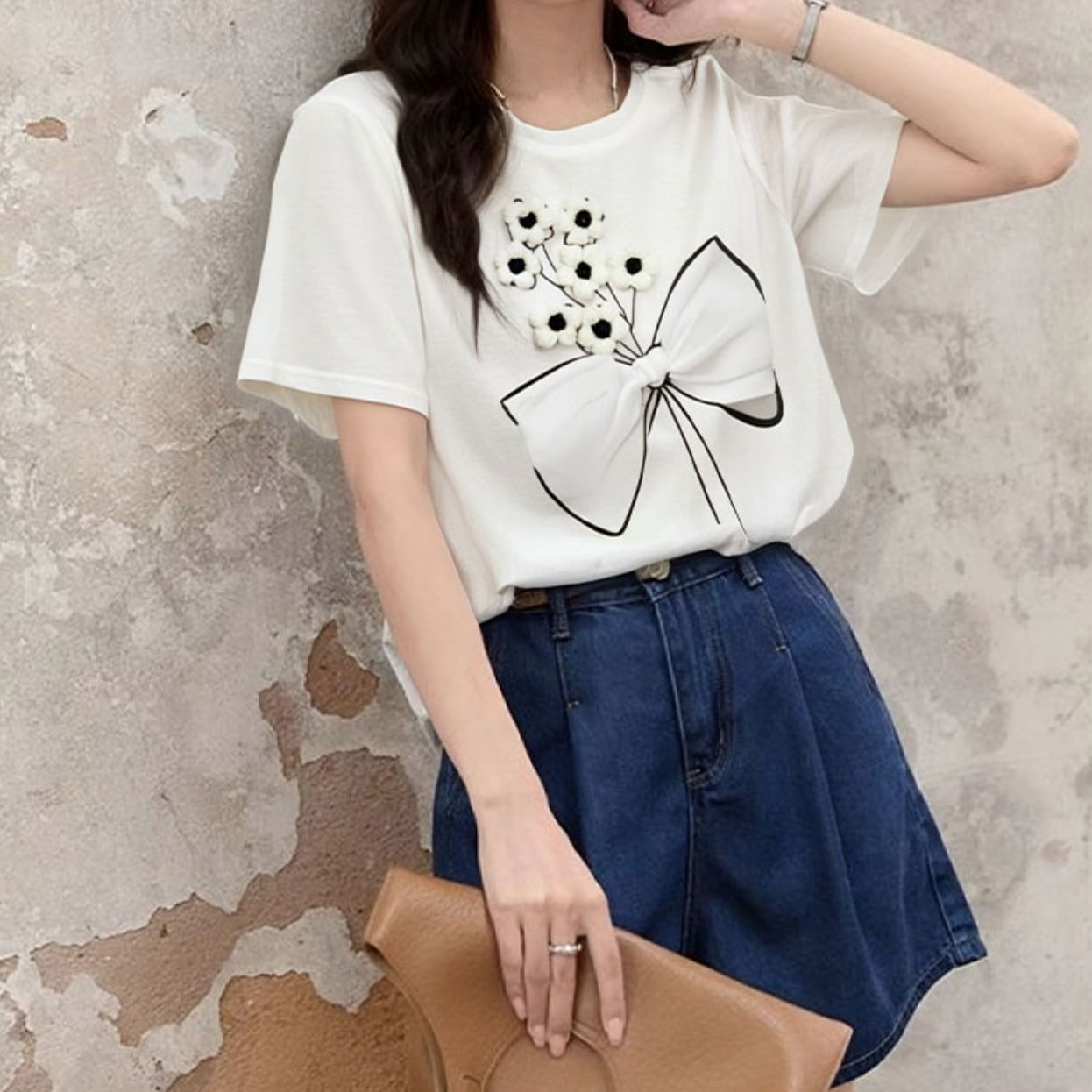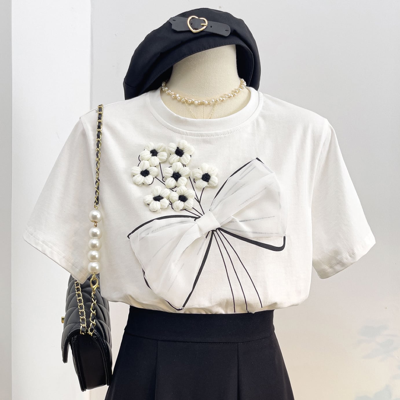 立体的なフラワーモチーフとシアーリボンが愛らしく映えるTシャツ。