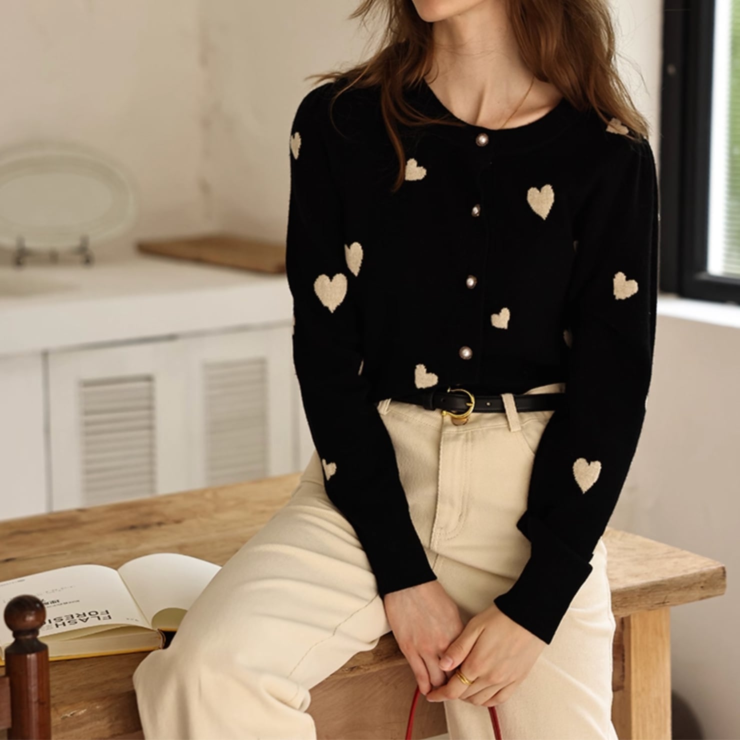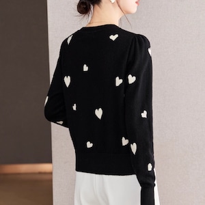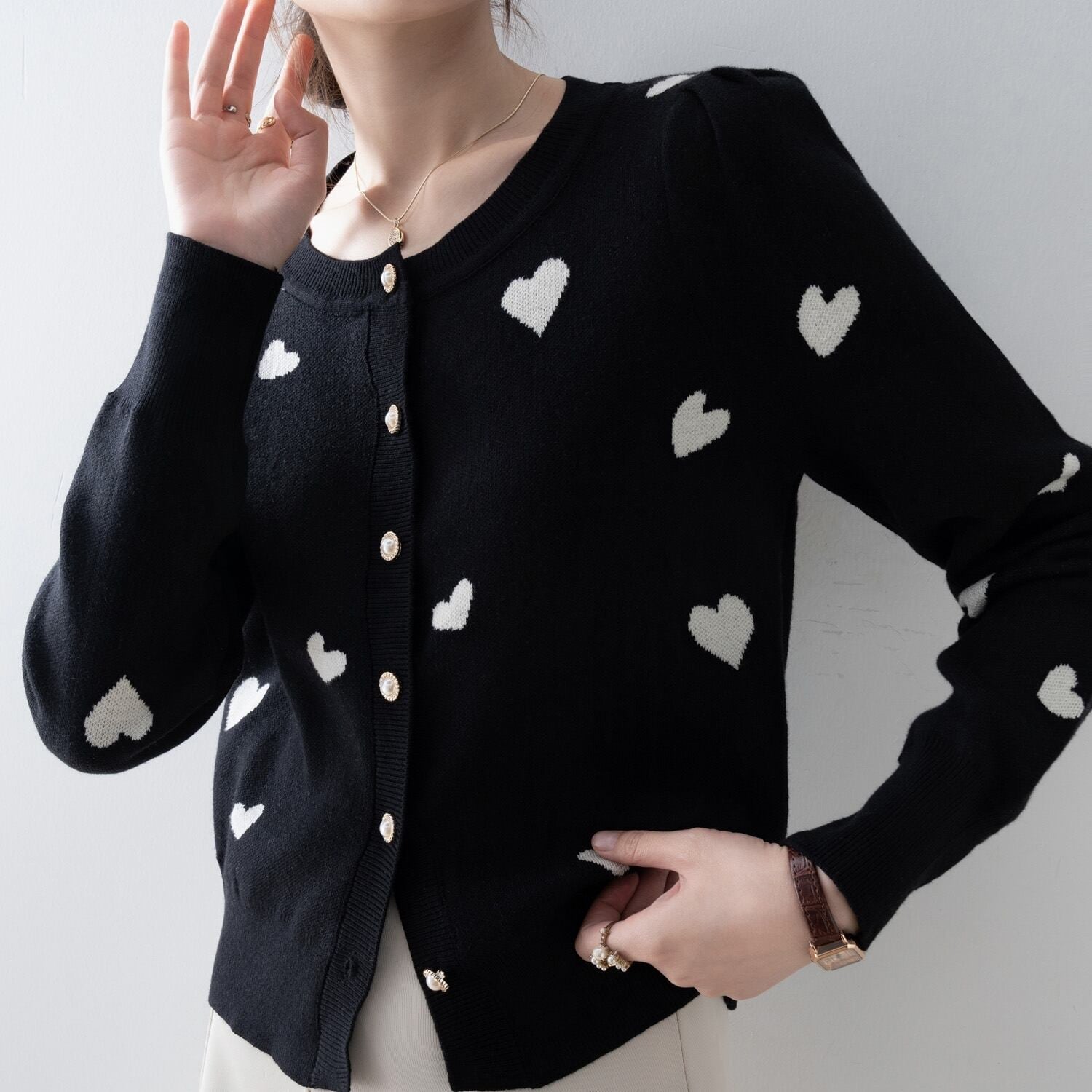 シックなブラックに愛らしいハート柄が映えるカーディガン。