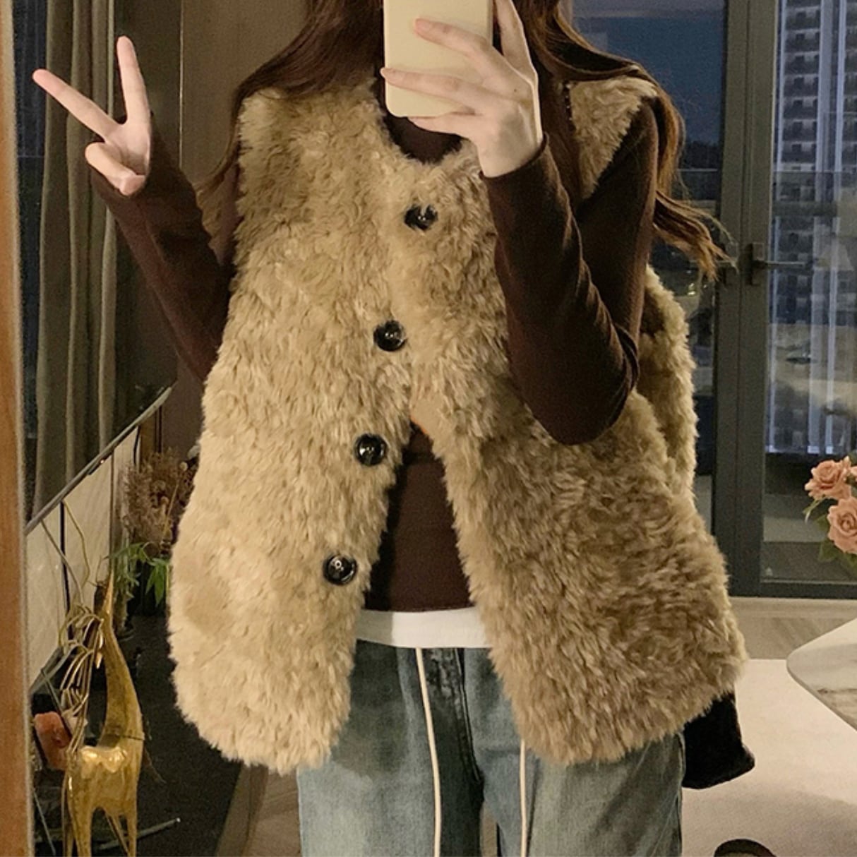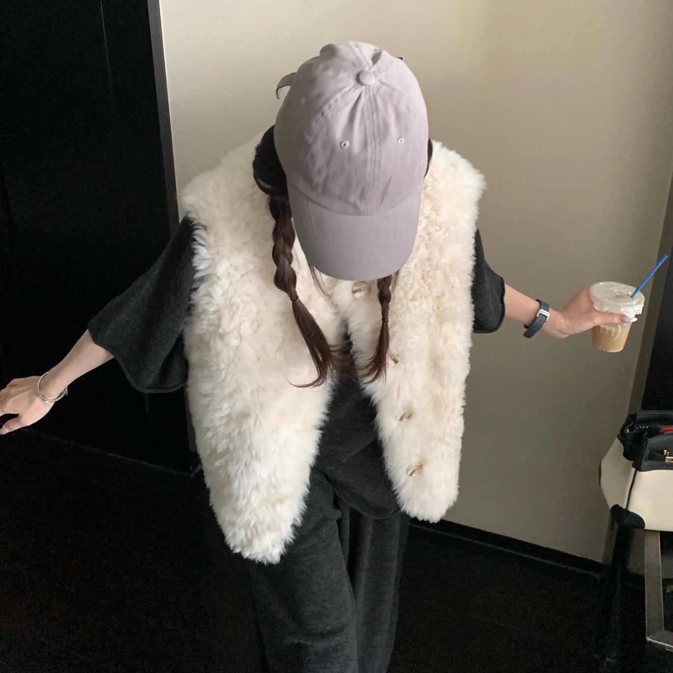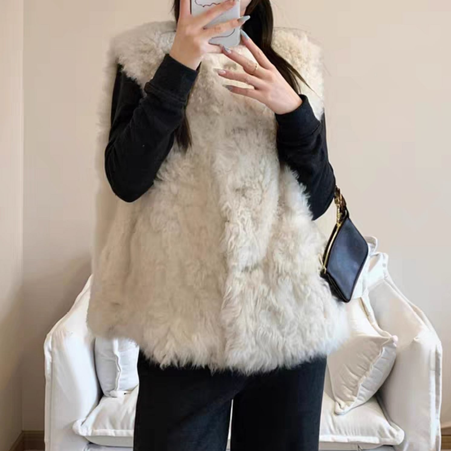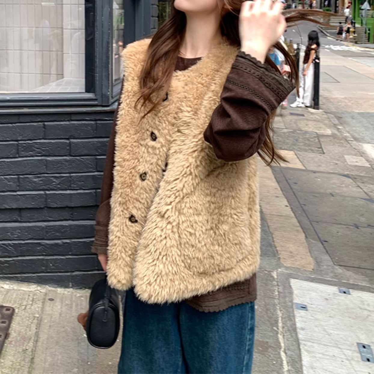 ふんわりとしたフェイクファーが季節感を引き立てるベスト。