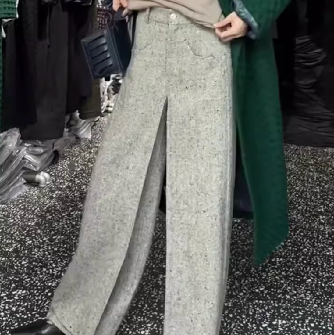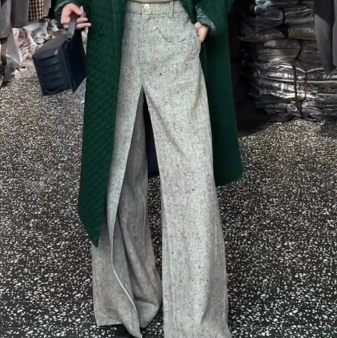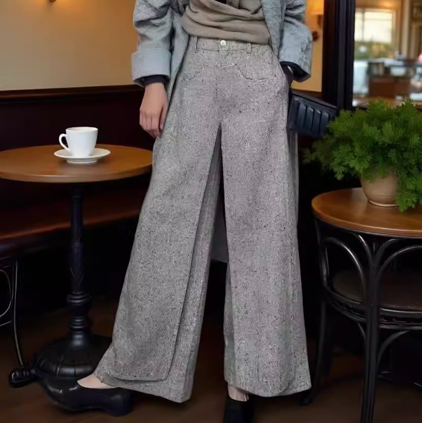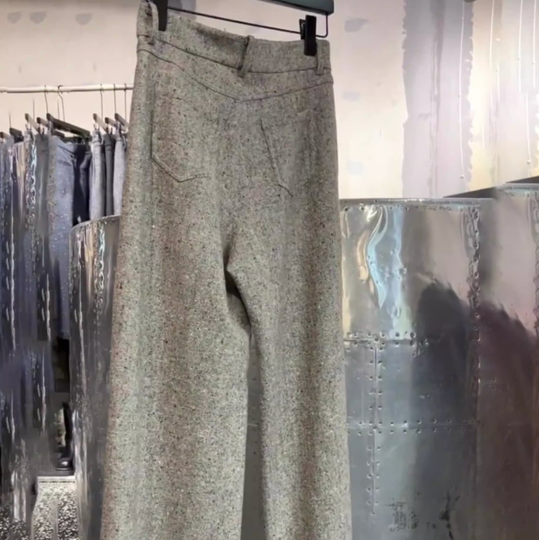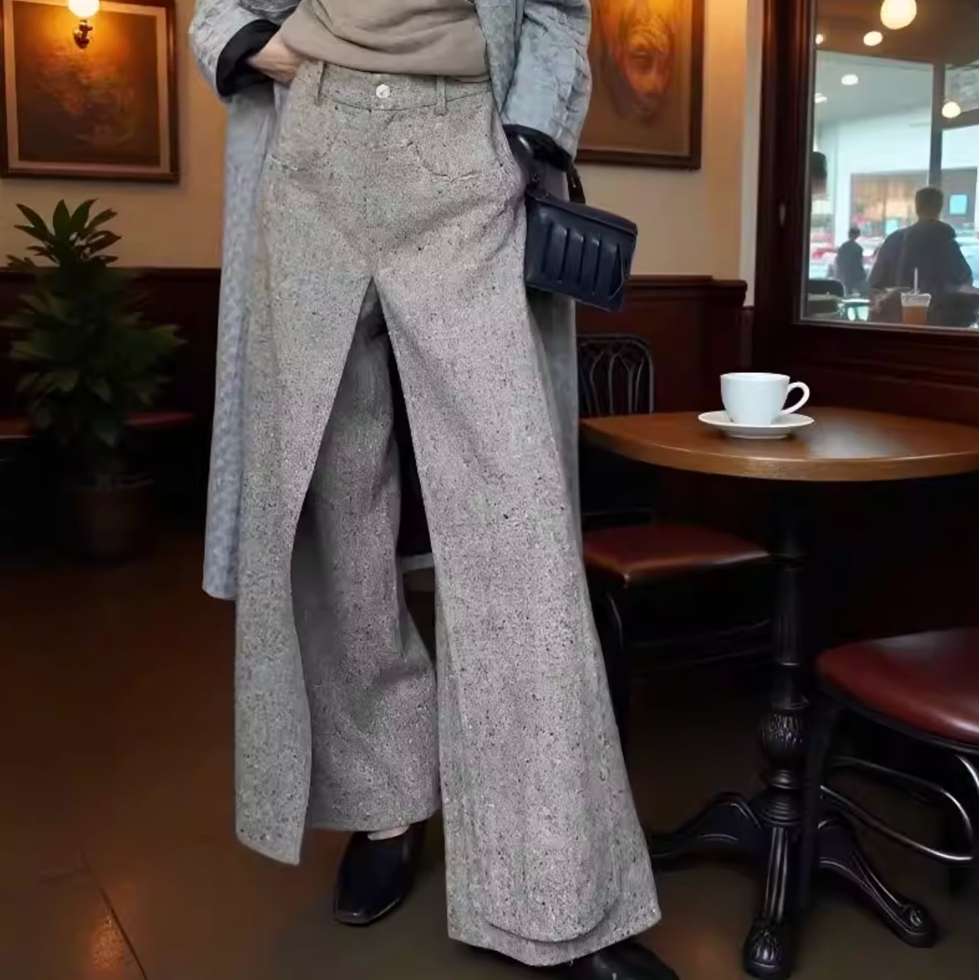上品なメランジ調生地に、深めのフロントスリットを効かせた個性派ワイドパンツ。