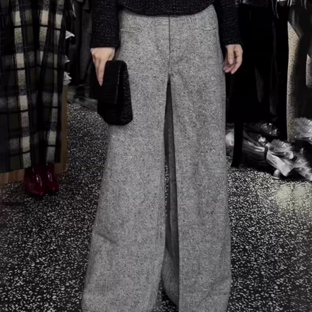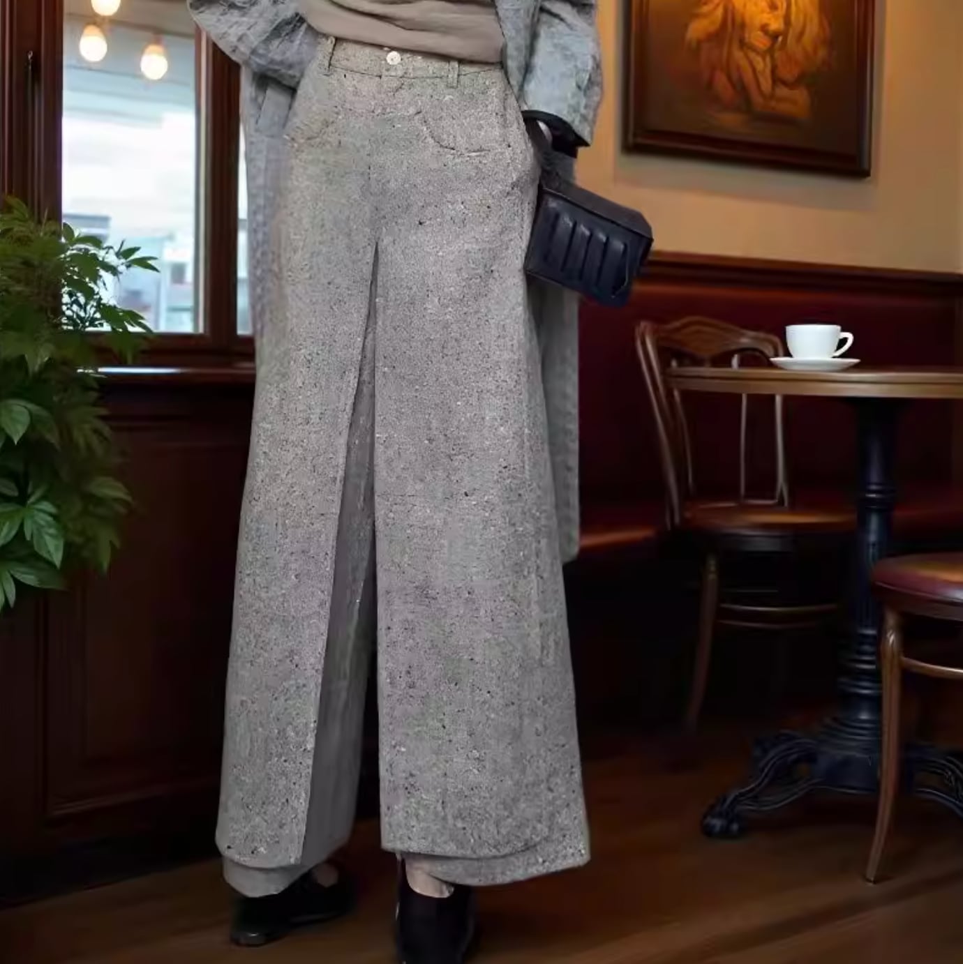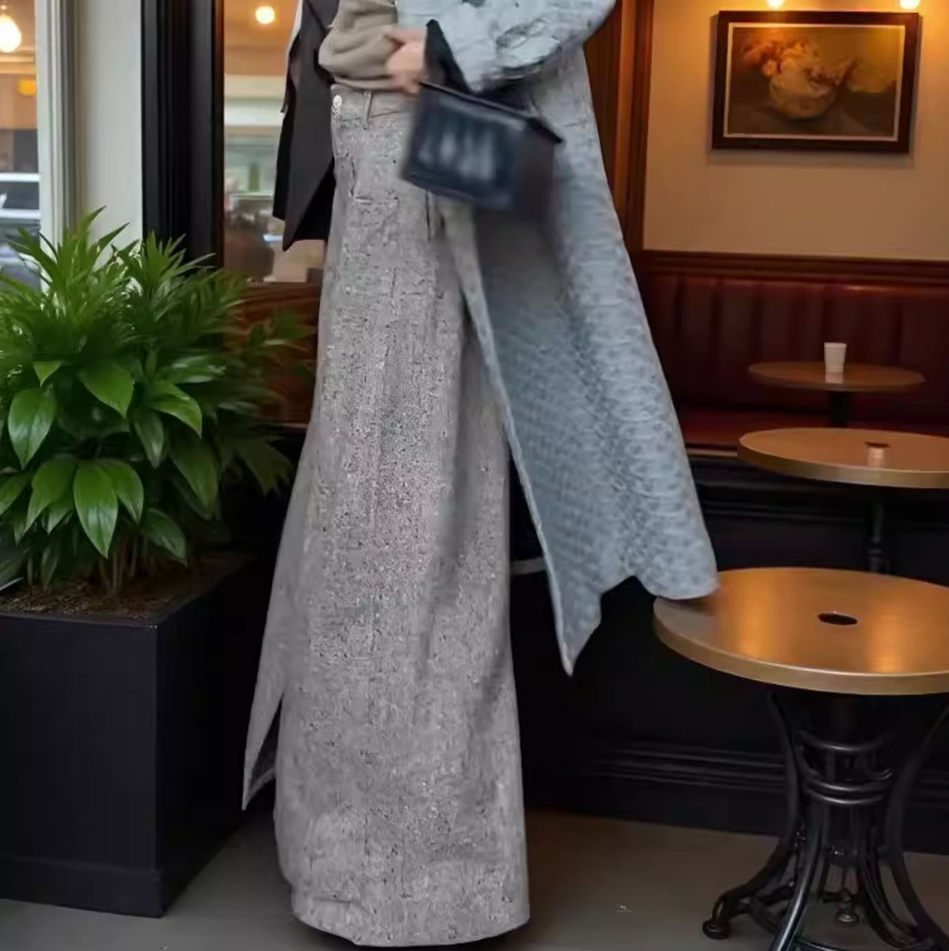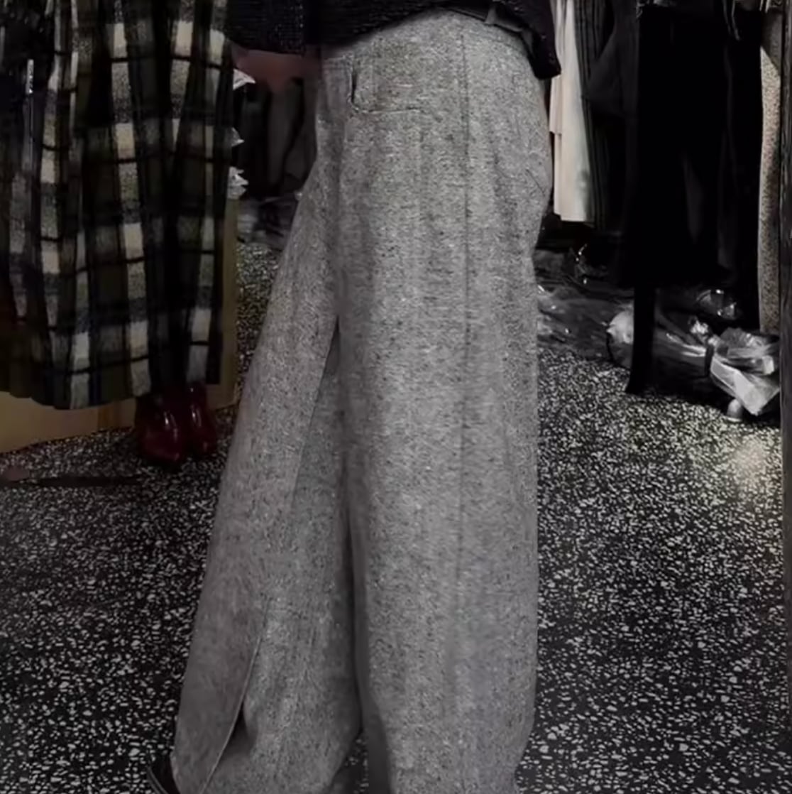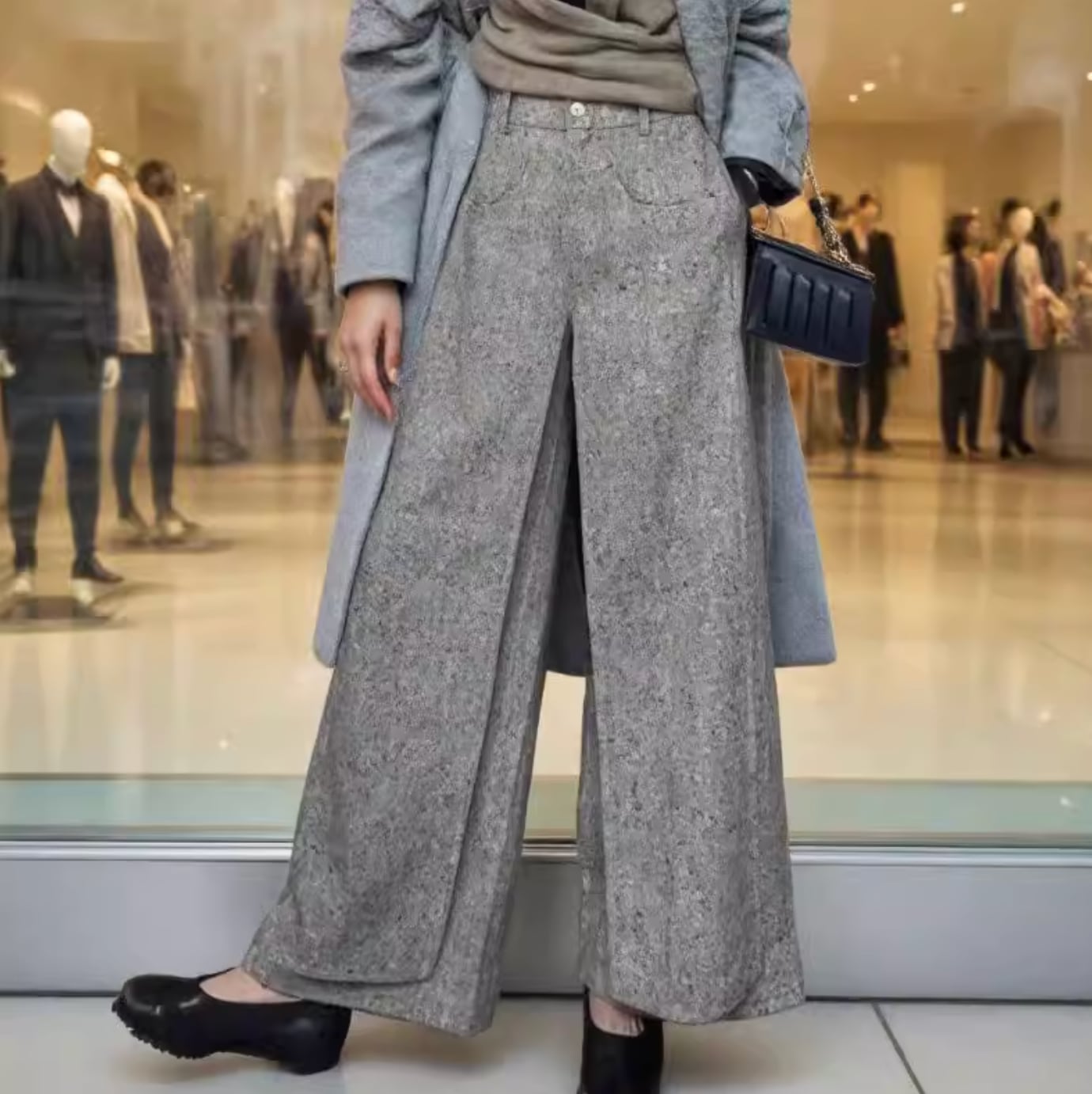 上品なメランジ調生地に、深めのフロントスリットを効かせた個性派ワイドパンツ。