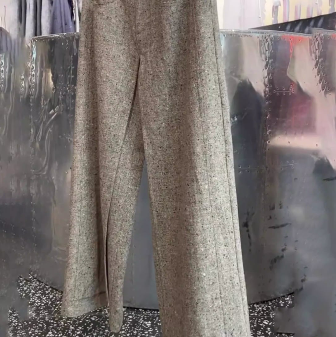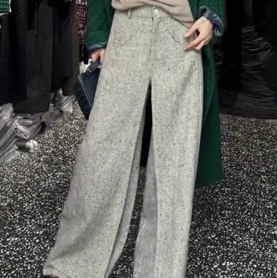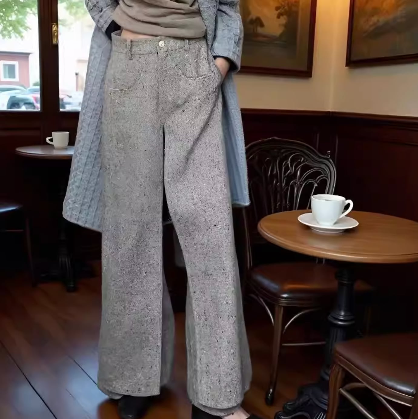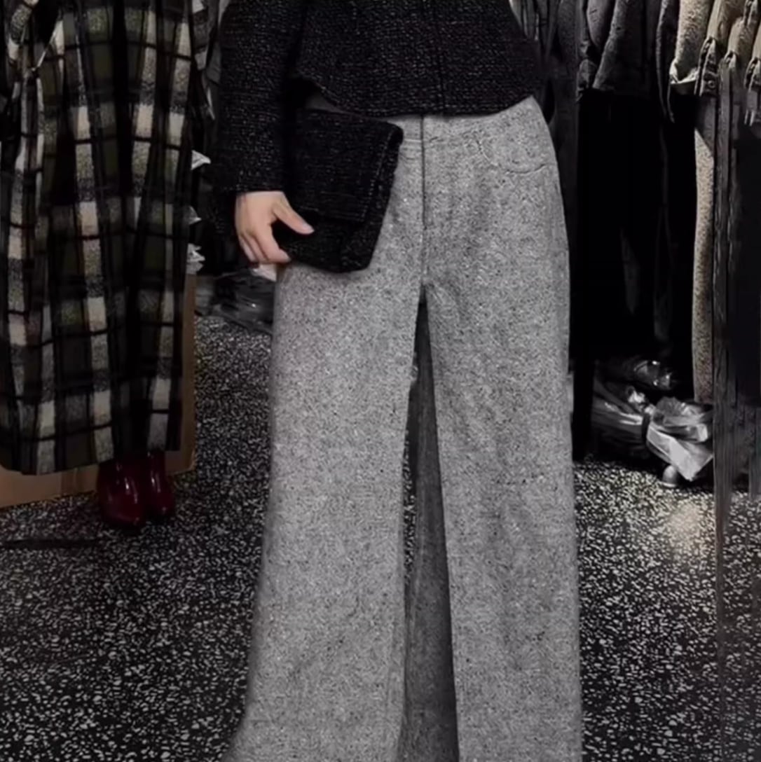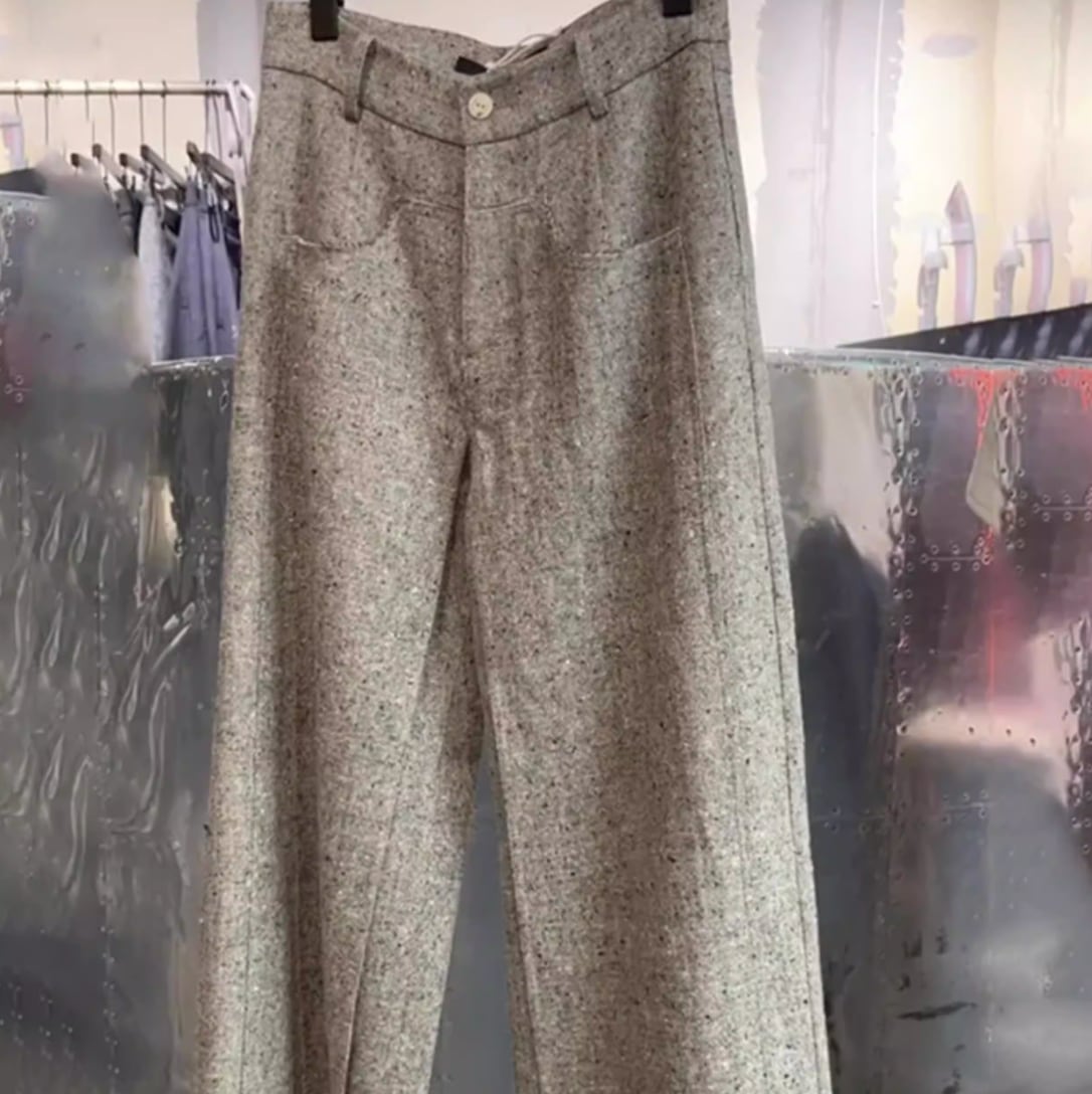 上品なメランジ調生地に、深めのフロントスリットを効かせた個性派ワイドパンツ。
