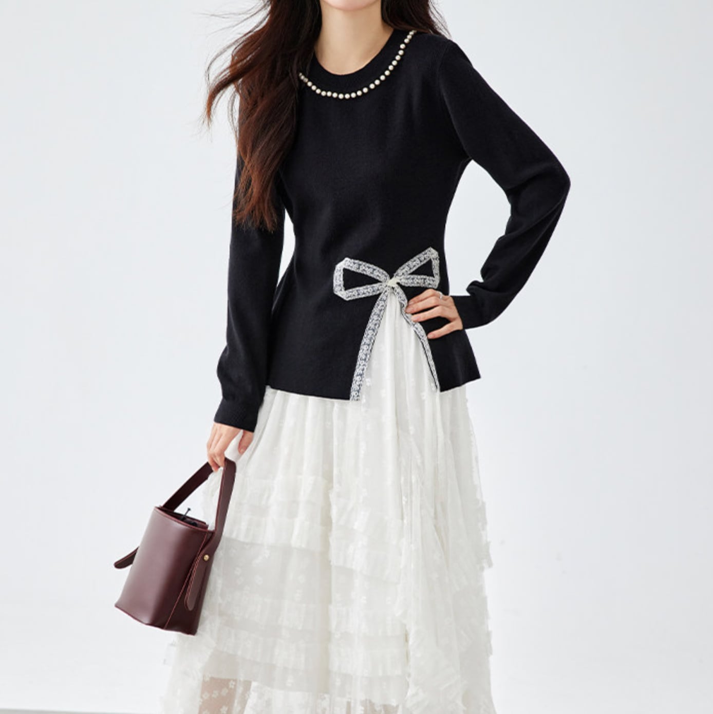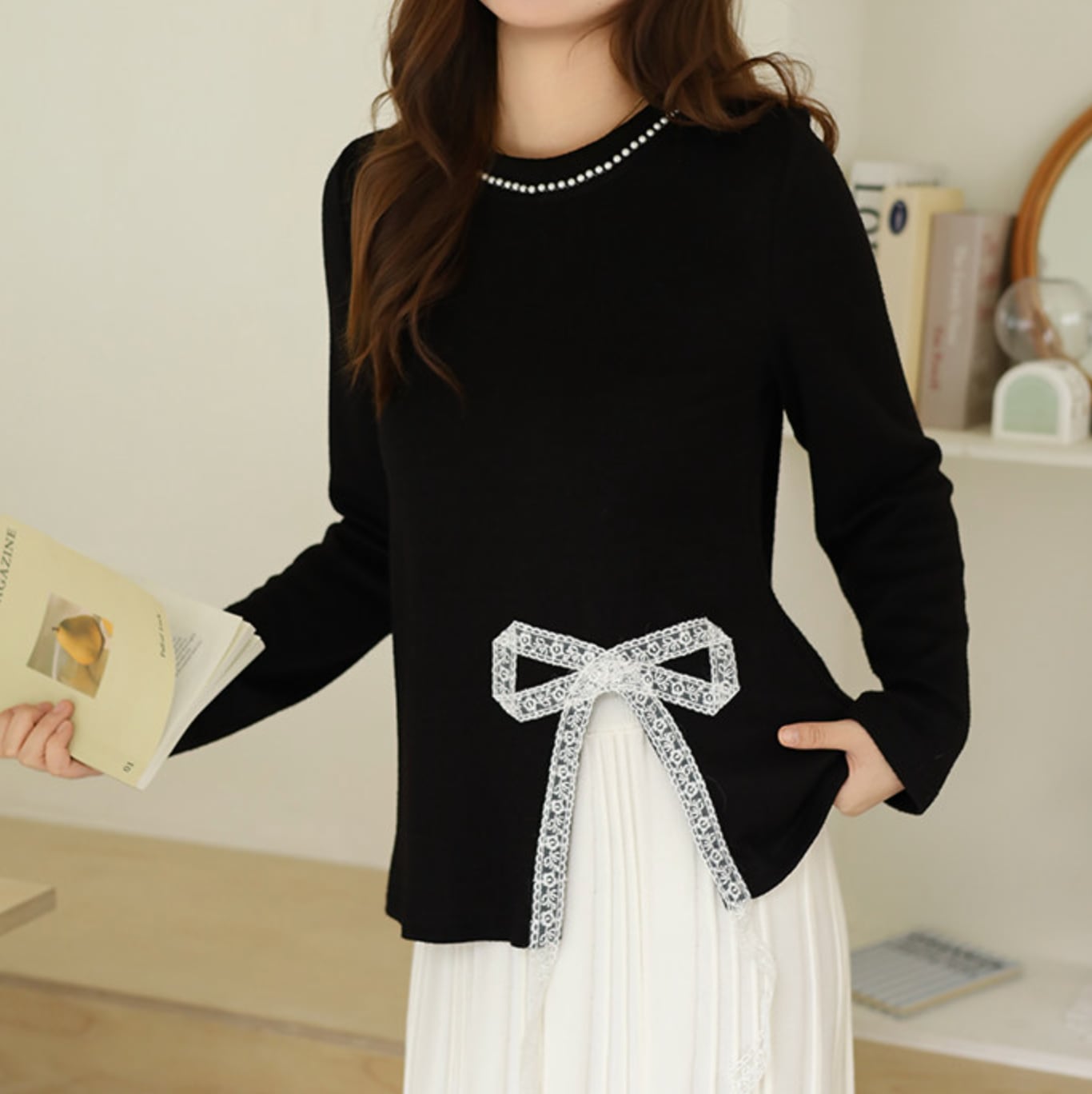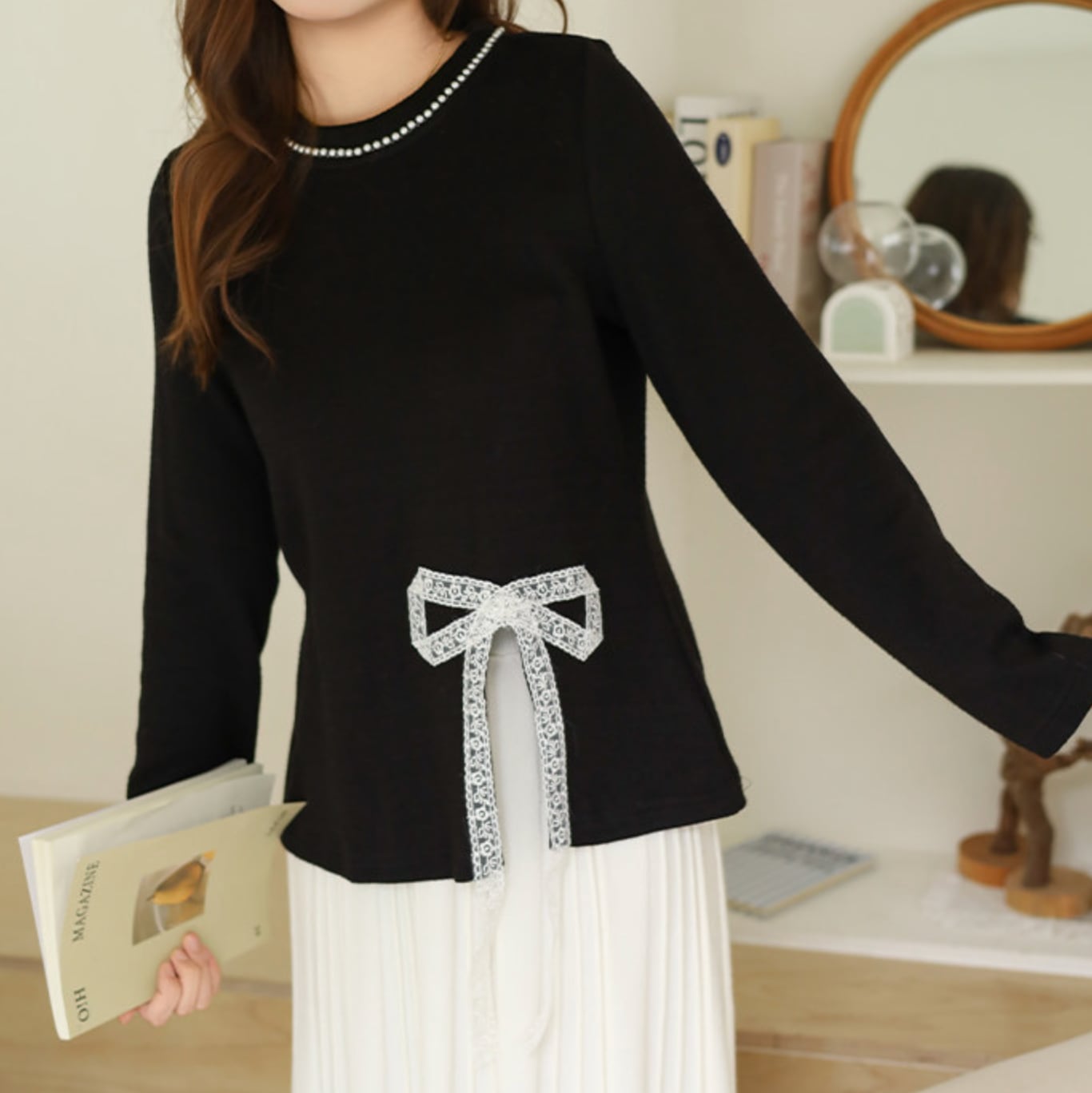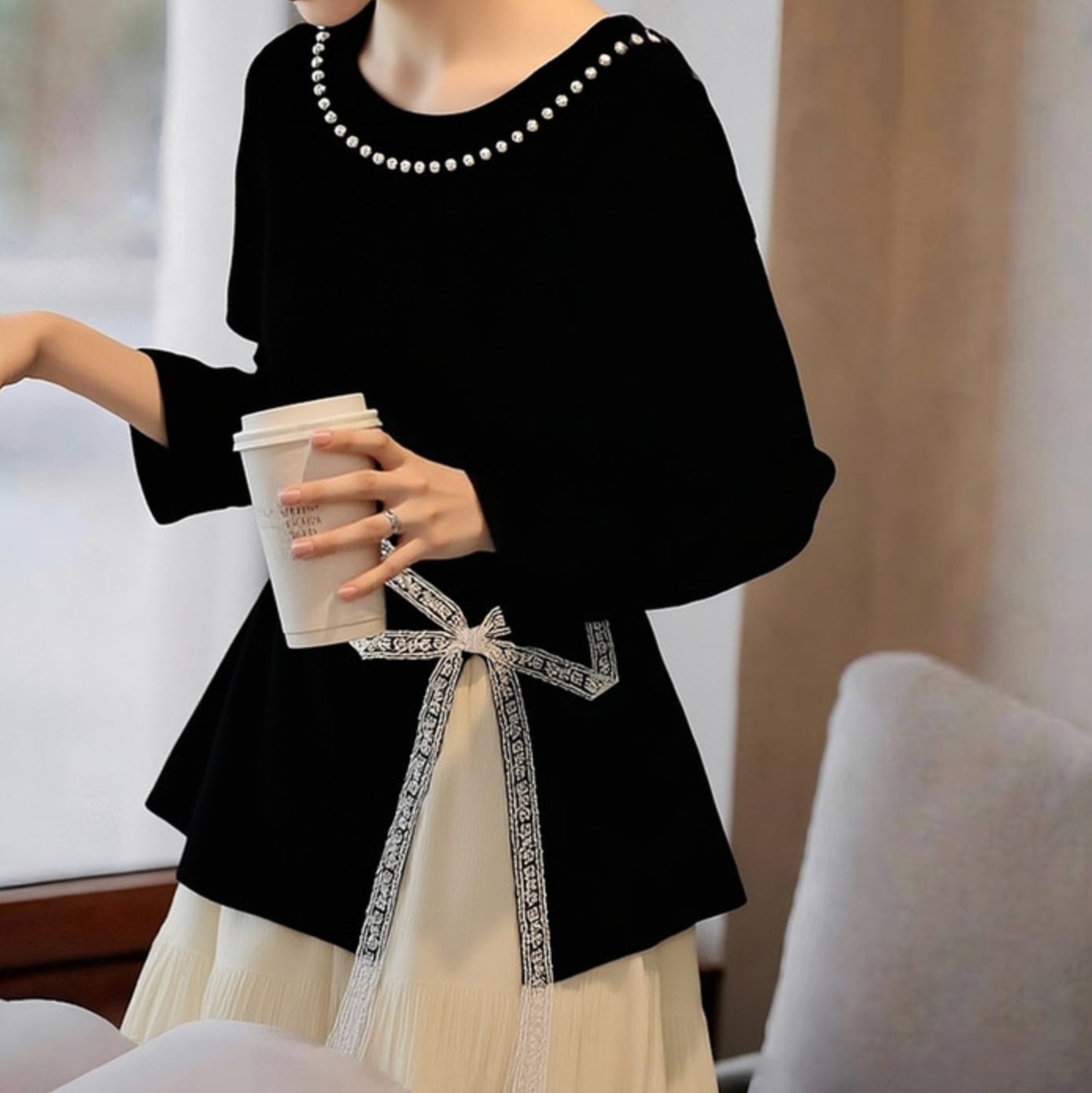 ネックラインにあしらったパール調ディテールと、ウエストのレースリボンが上品なアクセントに✧˖°