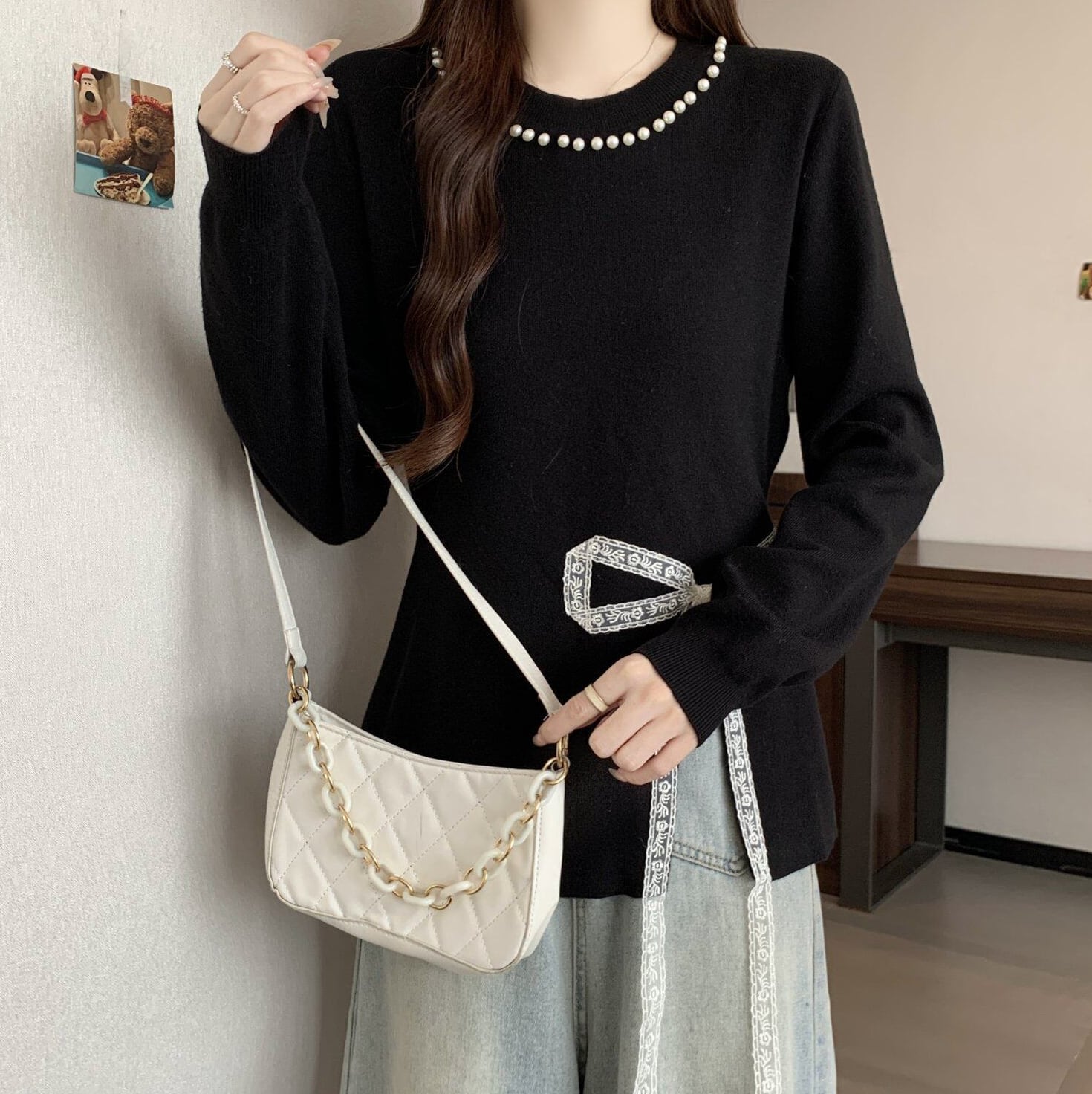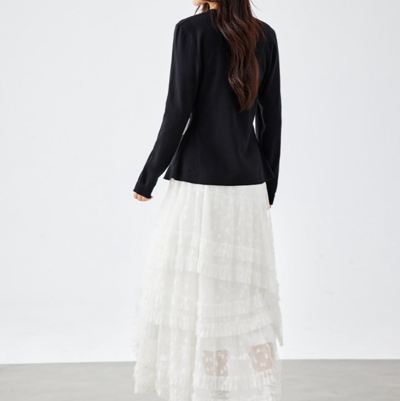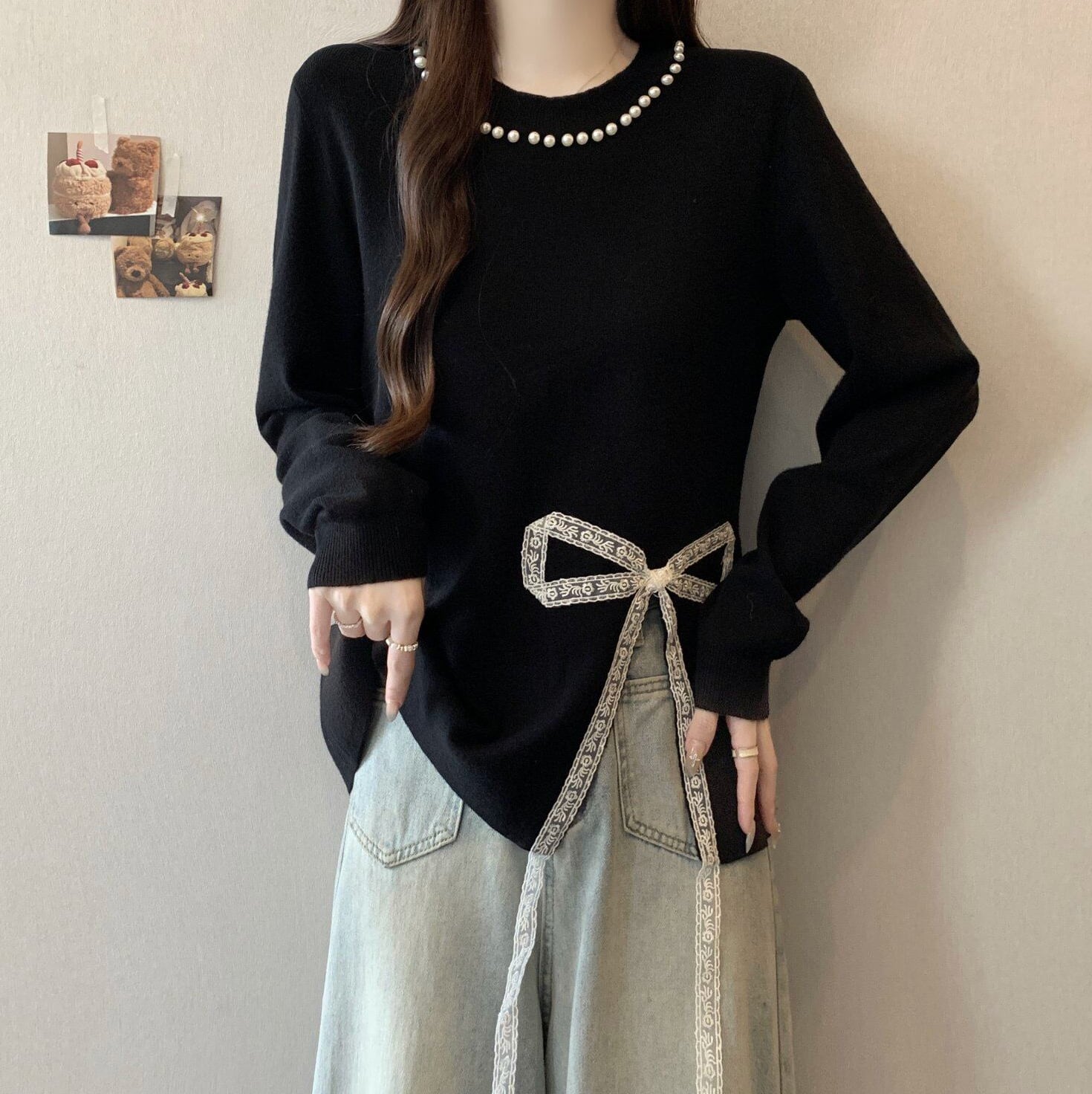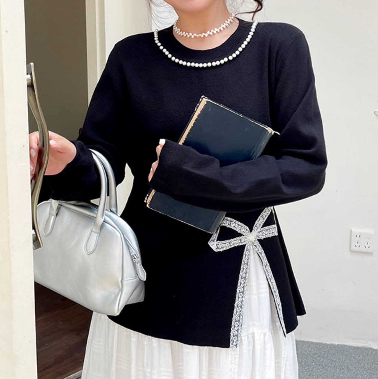 ネックラインにあしらったパール調ディテールと、ウエストのレースリボンが上品なアクセントに✧˖°