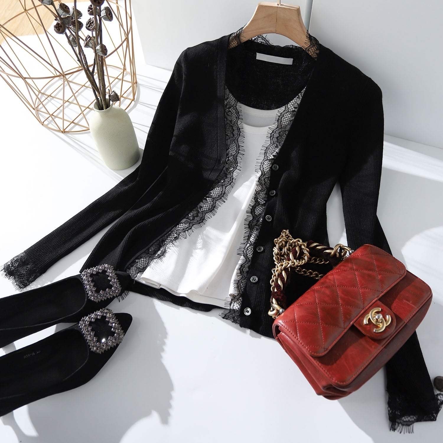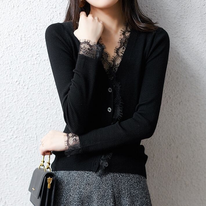 シンプルながらもネックラインや袖口のレースが映えるフェミニンなデザインのカーディガン✧