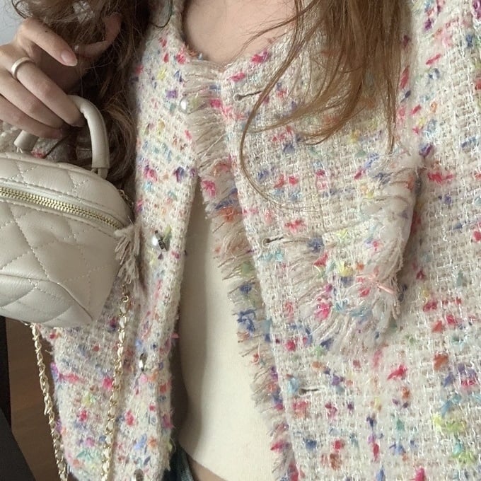ホワイトベースにカラフルな配色が愛らしいツイードジャケット♡