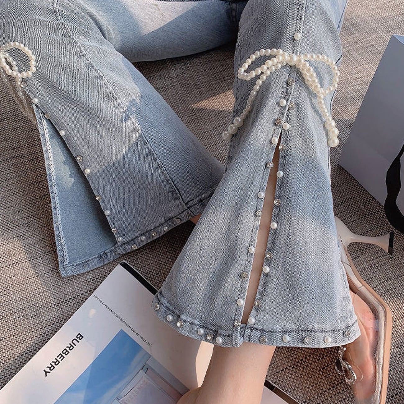 デニムのカジュアルさがありながらも、パールやビジューでフェミニンさをプラスした女性らしいアイテム♡