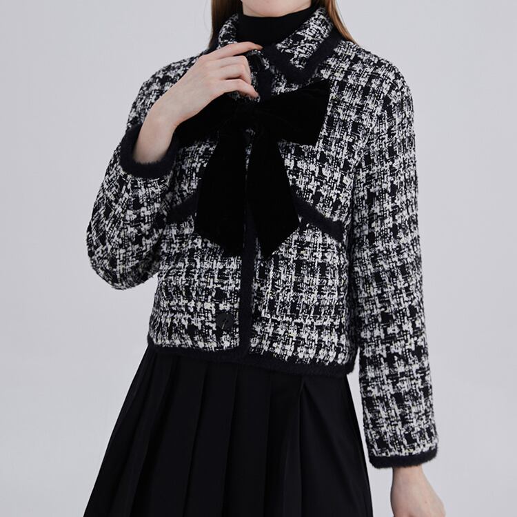 クラシカルなツイード素材にセンターリボンがアクセントとなったジャケット❢